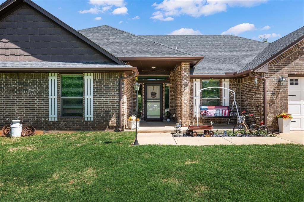 Some people build a house. These sellers built a lifestyle. If you've been waiting for the one that has it all - solid home, acreage, privacy, AND a shop that makes grown adults cry happy tears - this is it. Tucked into a cul-de-sac on nearly 2 acres in Timberland Valley, the long gravel drive pulls you back from the world before you even walk in the door. The 2020 Craftsman/Dallas-style home offers 4 beds, 2 baths, and 1,877 sq ft. The living, dining, and kitchen flow together in one seamless open layout - wood-burning fireplace with electric insert, granite counters, bold blue island, and enough counter space to actually cook. The primary suite has large walk-in closet and is tucked away on one side of the home; the other three beds and full bath sit on the opposite side. The primary bath features dual vanities, a soaking tub, and walk-in shower. Let's be honest, you're here for the shop, and this 30x40 steel shop is the main event: 6 reinforced slab, pillars anchored 13 into footing, fire-retardant insulation, 220 power, two mini-splits, LED lighting, 12-ft direct-drive garage door, and a sliding glass door to a covered patio with string lights and all the ambiance you didn't know you needed. Seller open to negotiating one of the vehicle lifts. The 20x30 concrete slab out front is basically a basketball court waiting to happen. Carport out back for overflow parking or storage. The details keep coming: whole-home water filtration, modified aerobic septic that irrigates the front and side yards, RGB LED soffit lighting, vintage backyard street light, photo-cell perimeter lighting, in-ground storm shelter, storage shed, fenced backyard area (dog owners, you're welcome), and a fire pit tucked along the treeline that feels like its own world. Cherry on top is the huge stocked pond, complete with dock access - bring your paddle boats and kayaks. Minutes to Guthrie Country Club, quick I-35 access to Edmond and OKC. 0% down USDA financing eligible.